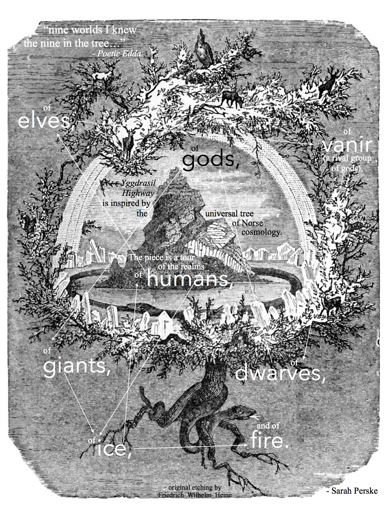 yggdrasil highway is inspired by the universal tree of Norse cosmology. The piece is a tour of the realms of humans, of elves, of vanir, of dwarves, of gods, of giants, of ice, and of fire.